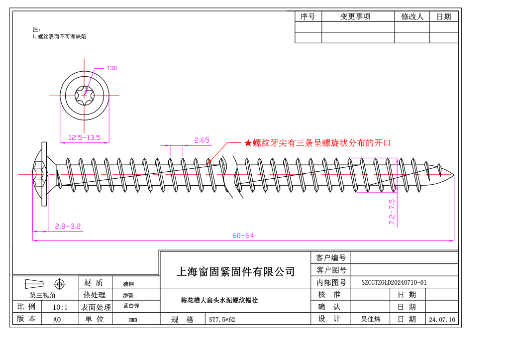 梅花大扁头水泥螺纹锚栓~7.5*62~蓝白锌