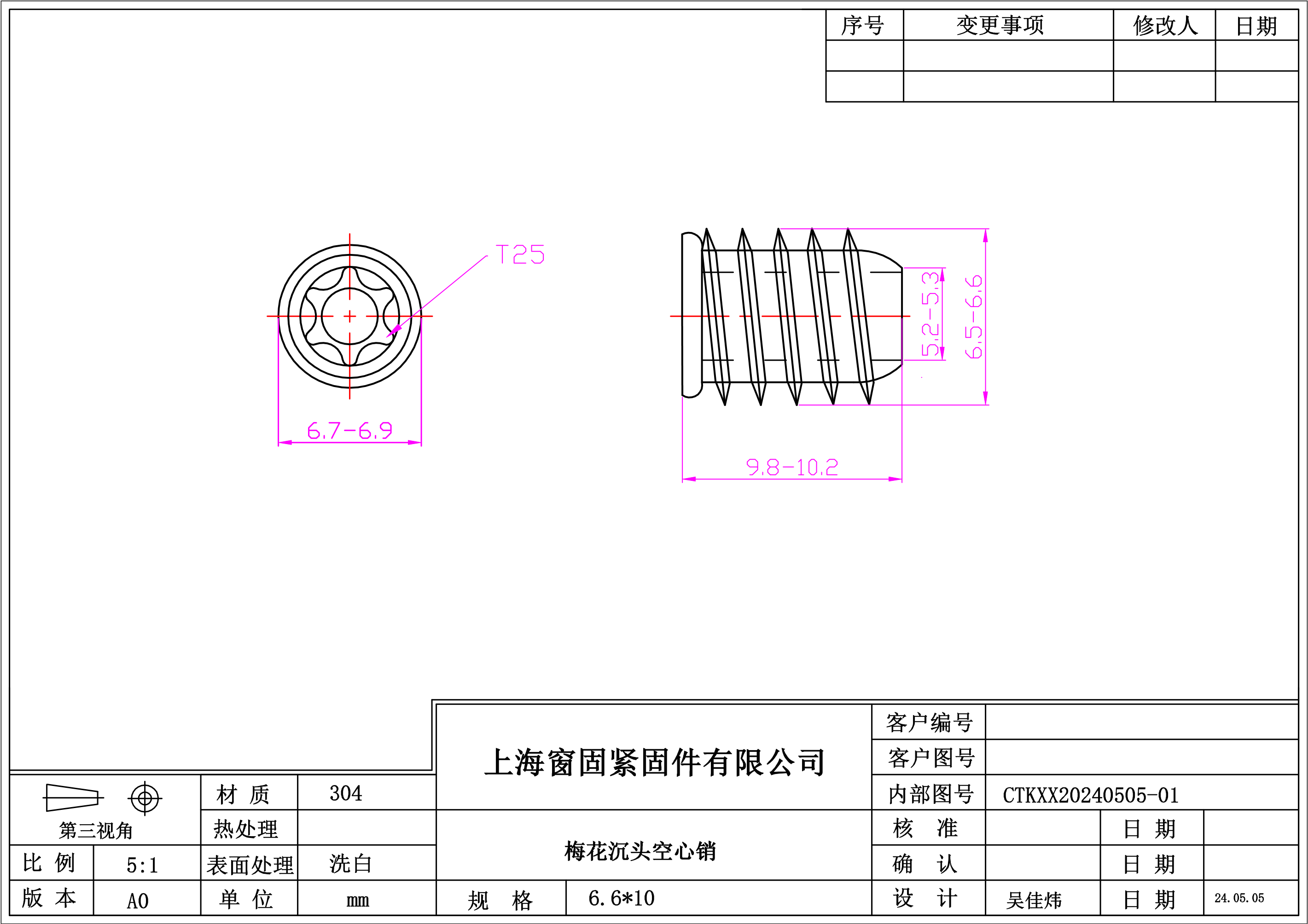 不锈钢304梅花沉头空心销~6.6*10~洗白~(外螺纹)