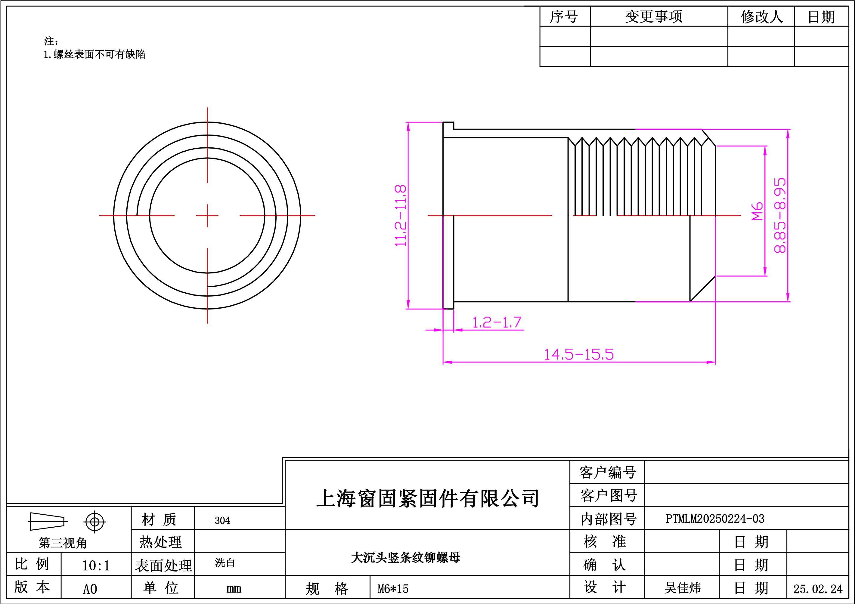 不锈钢304大沉头竖纹铆螺母~6*15~洗白
