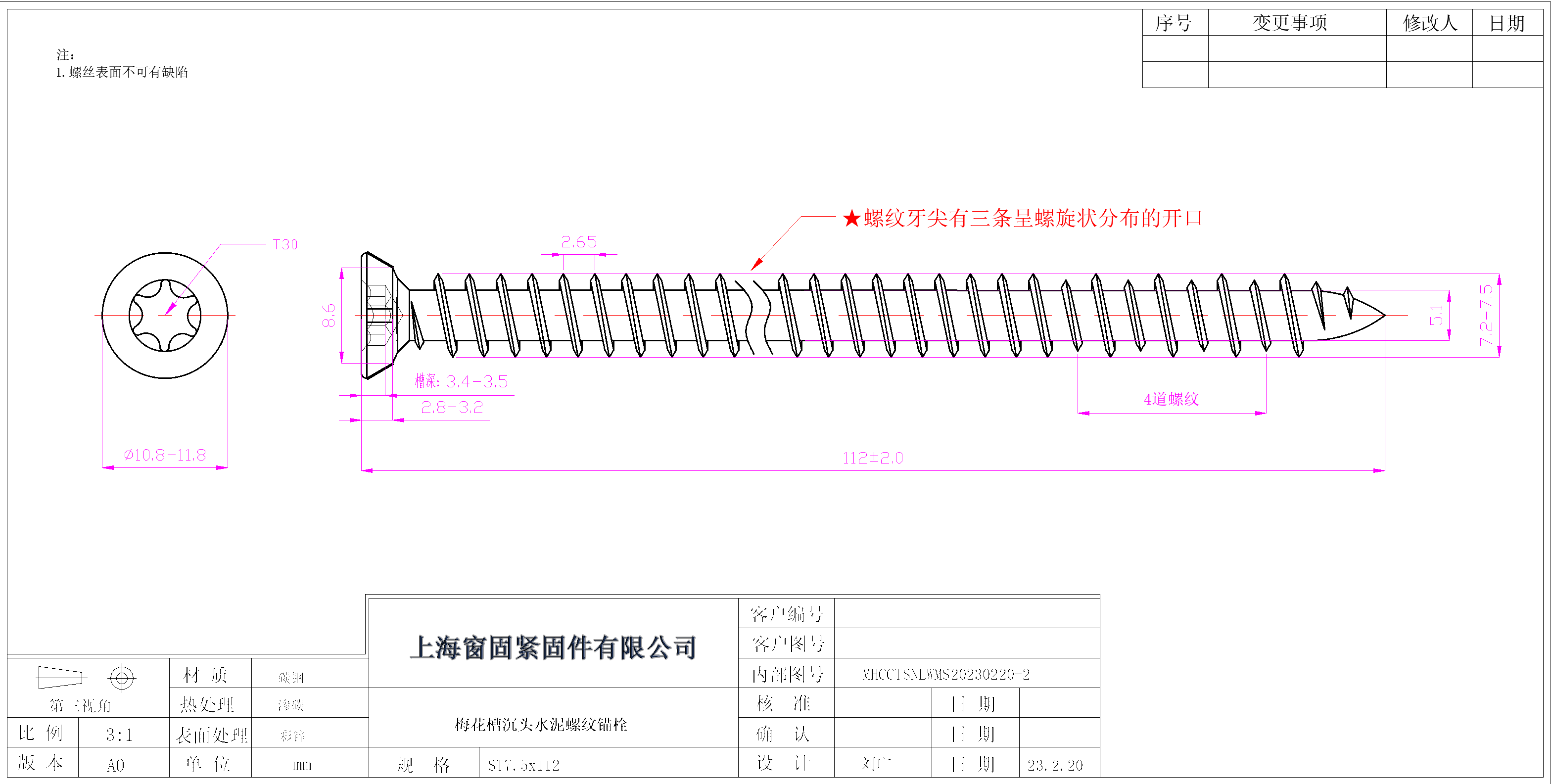 梅花沉头水泥螺纹锚栓~7.5*112~五彩锌~(线径5.6)