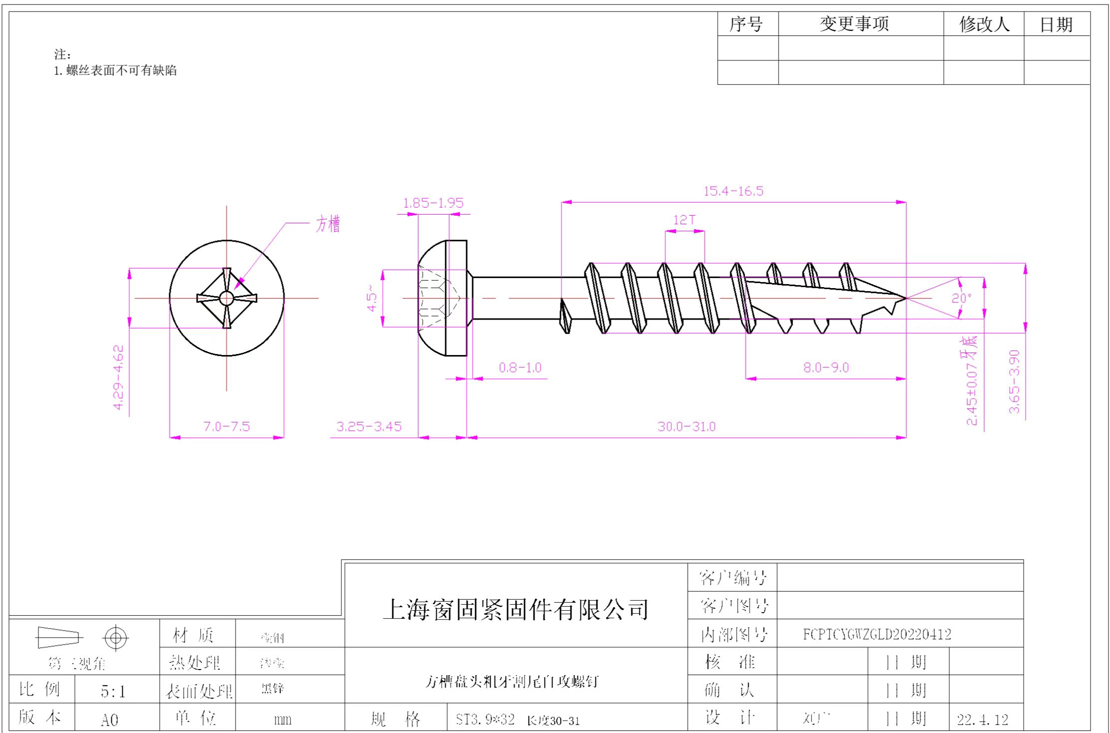 四方盘头割尾木螺钉~3.9*31~黑锌
