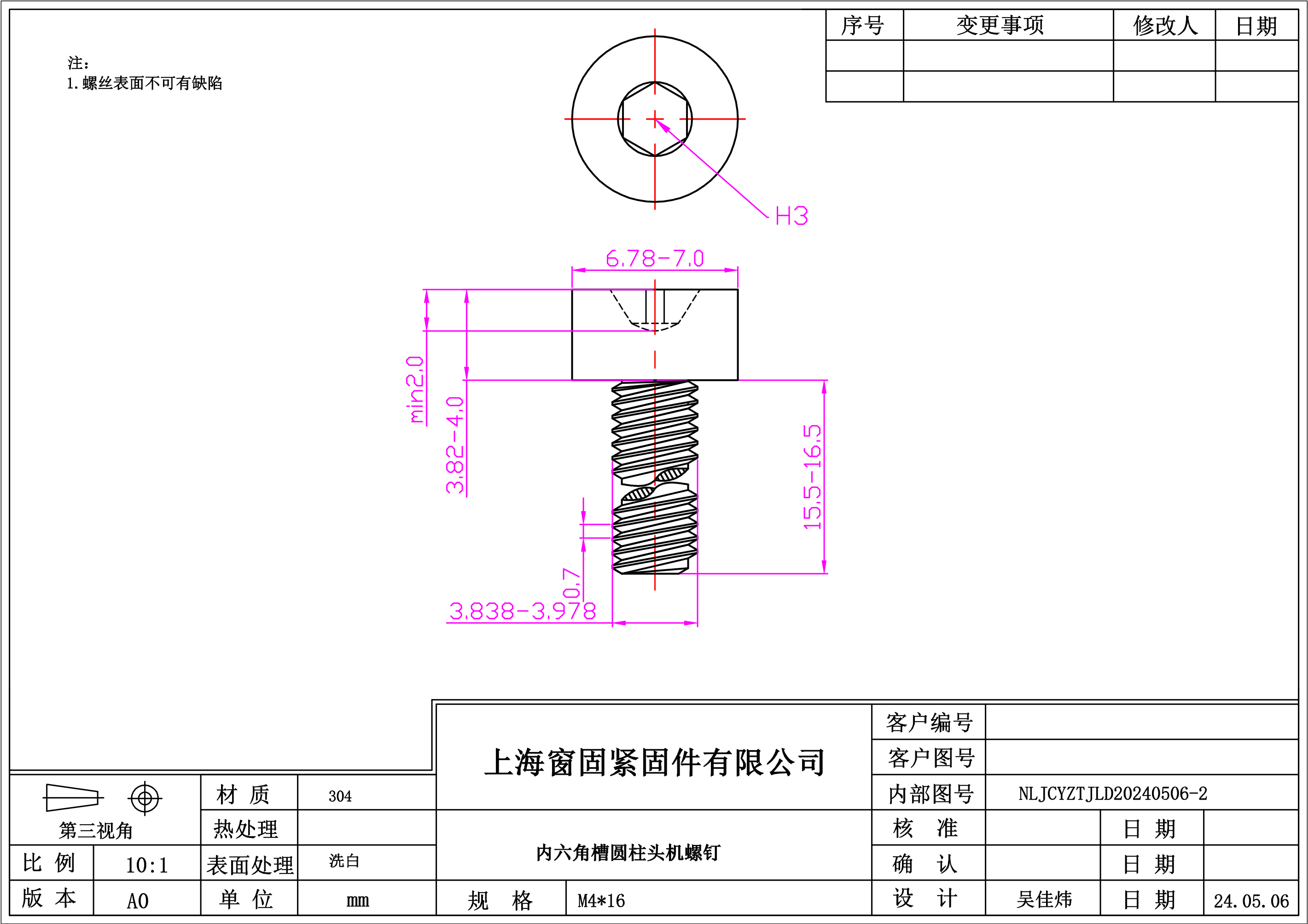 不锈钢304内六角圆柱头机螺钉~4*16~洗白