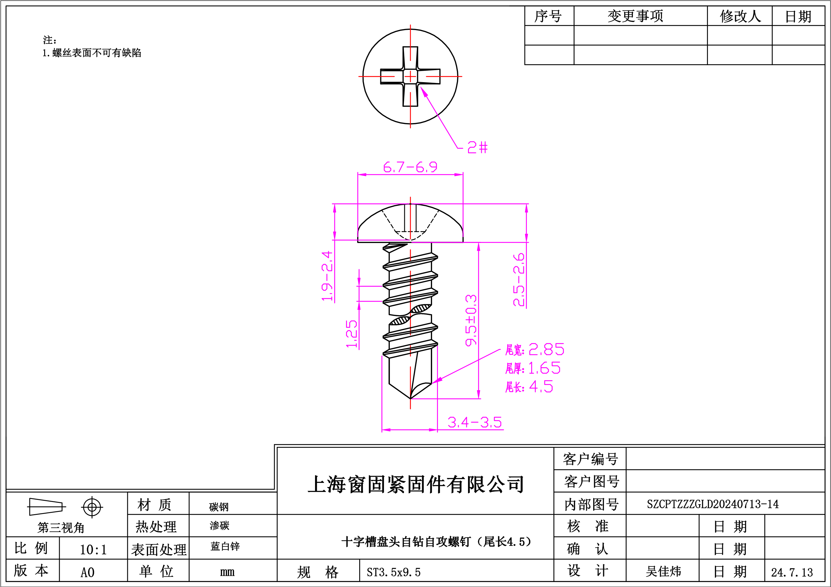 十字盘头自钻自攻螺钉~3.5*9.5~蓝白锌~(尾长4.5)