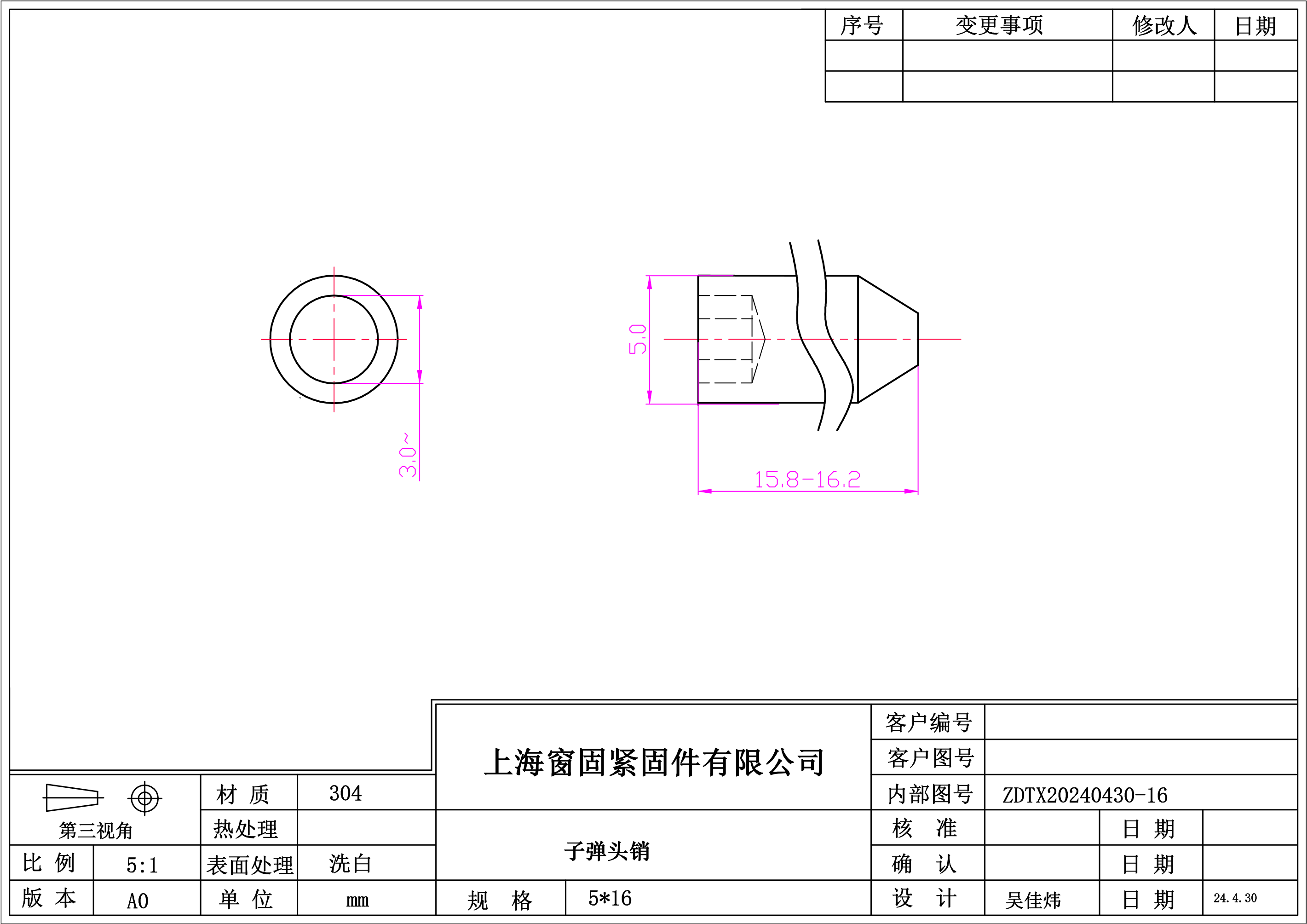 不锈钢304子弹头销~5*16~洗白