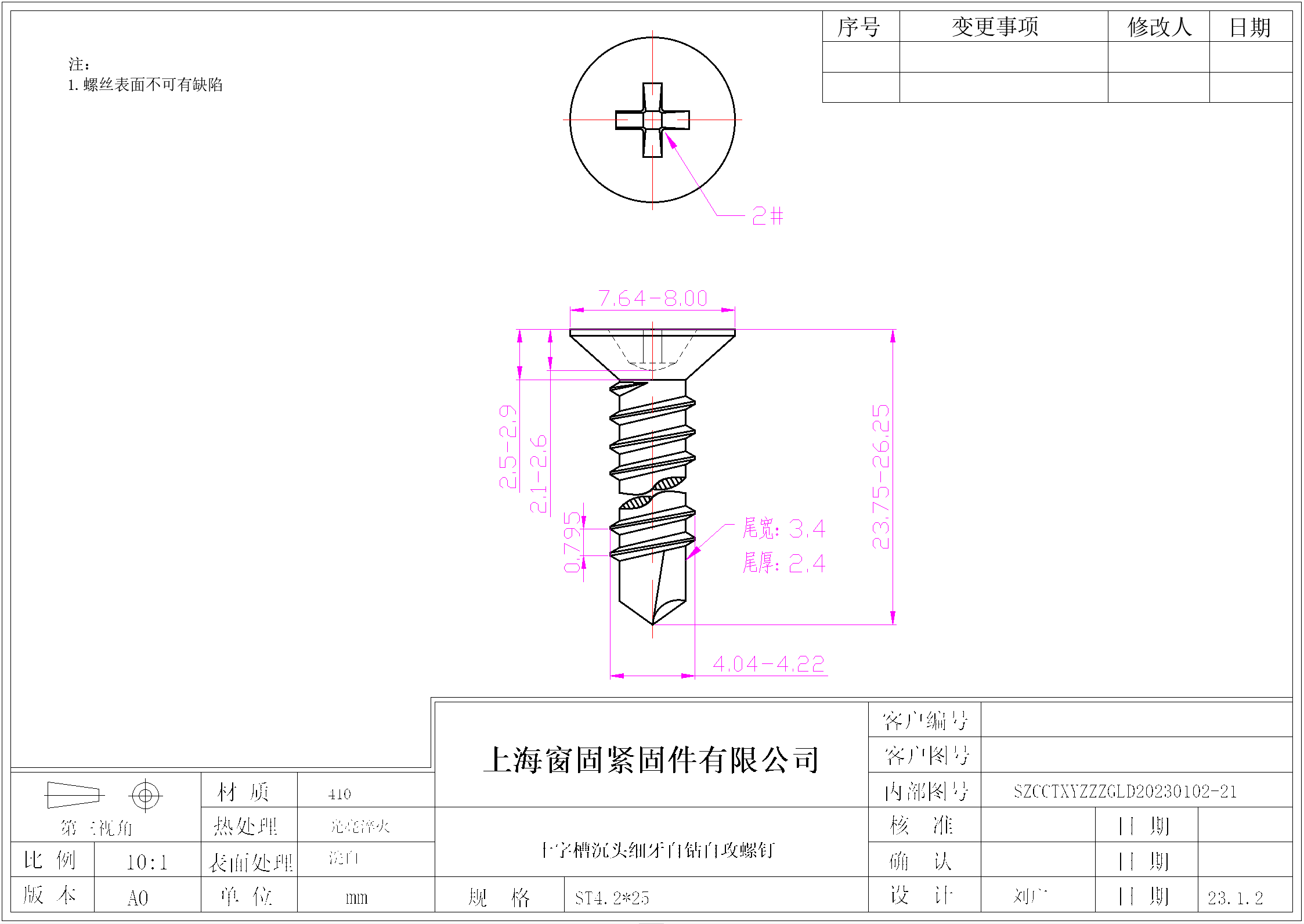 不锈钢410十字沉头细牙自钻自攻螺钉~4.2*25~洗白