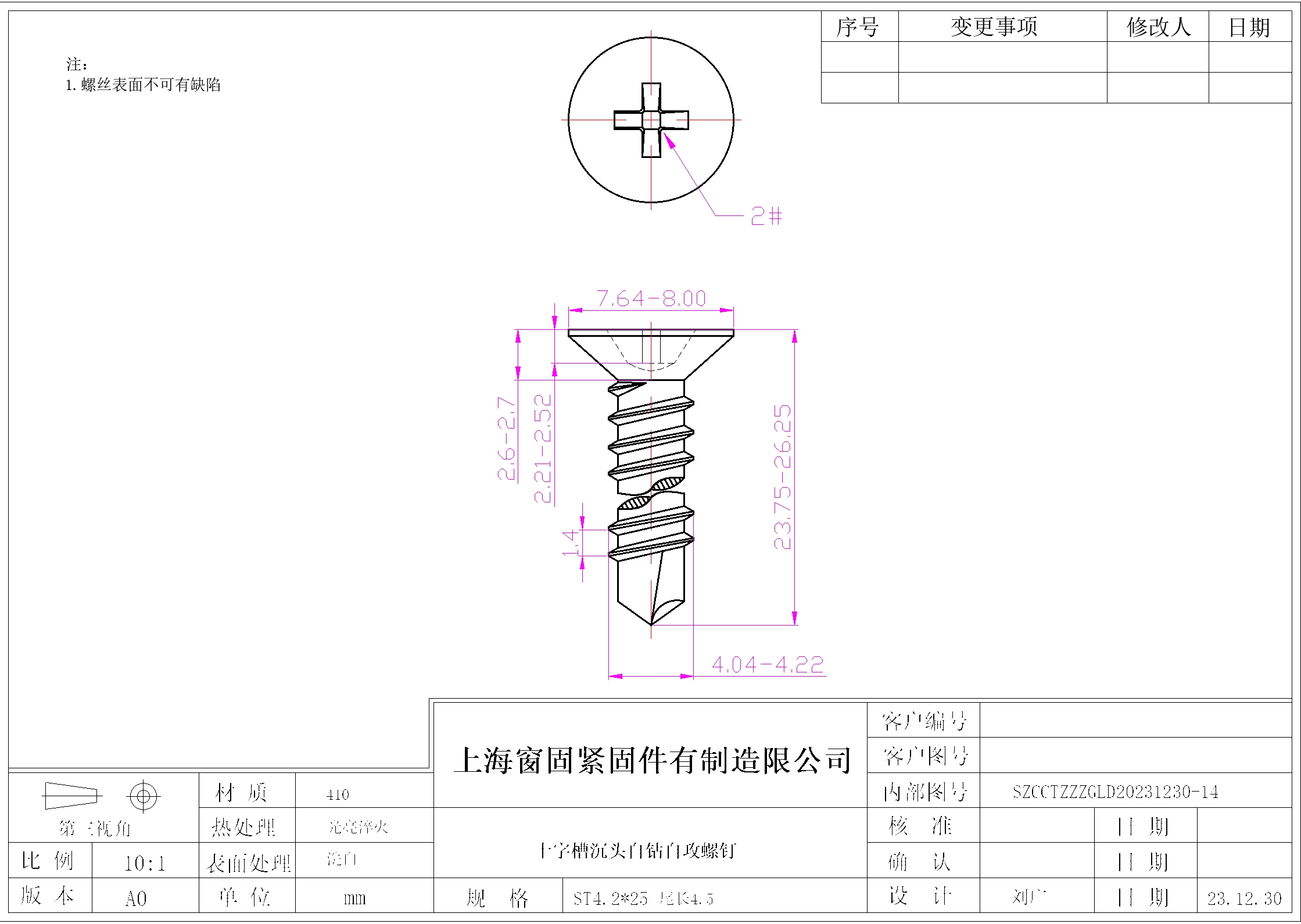 不锈钢410十字沉头自钻自攻螺钉~4.2*25~洗白~(尾长4.5)