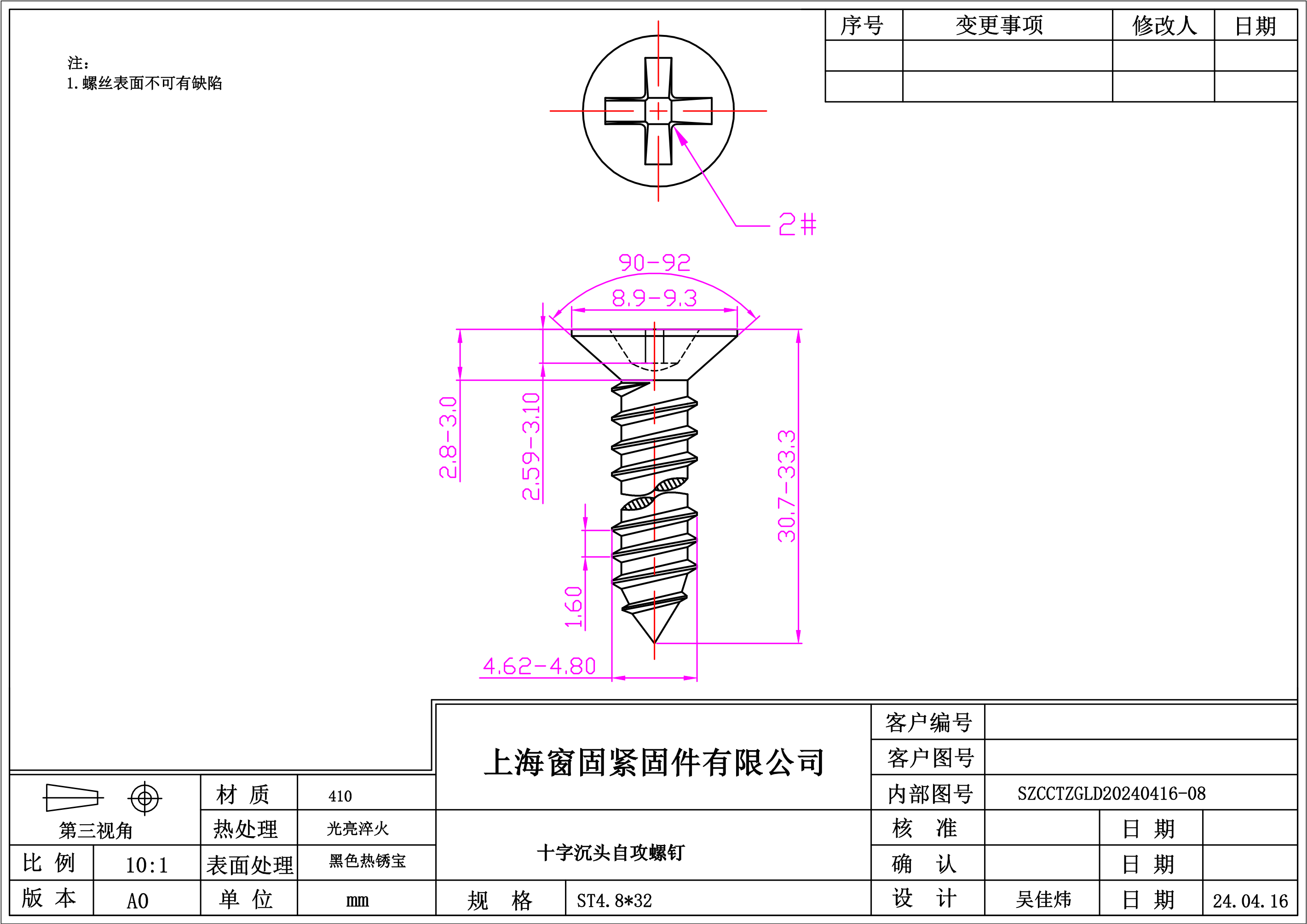 不锈钢304十字沉头自攻螺钉~4.8*32~洗白