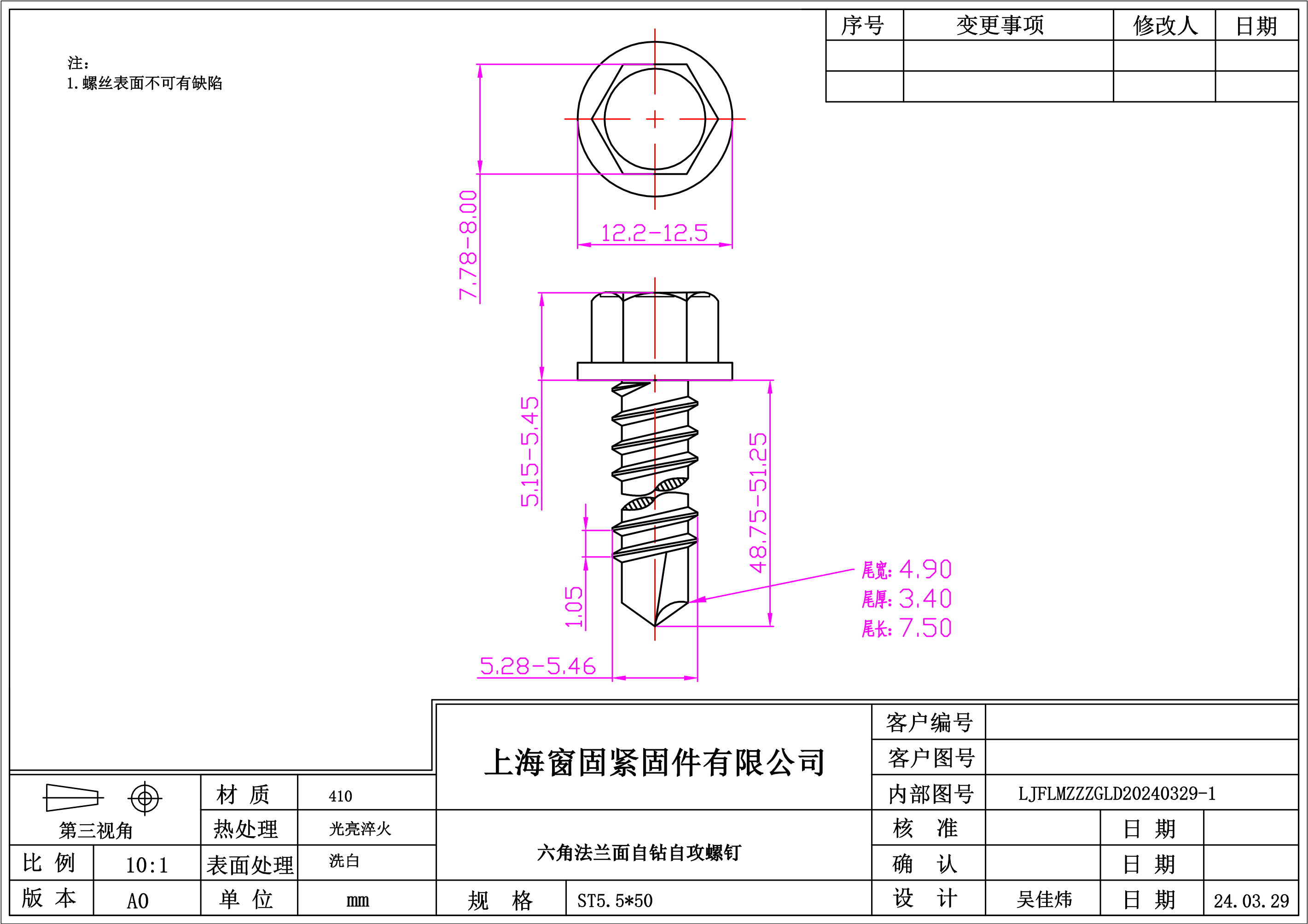 不锈钢410六角法兰面自钻自攻螺钉~5.5*50~洗白