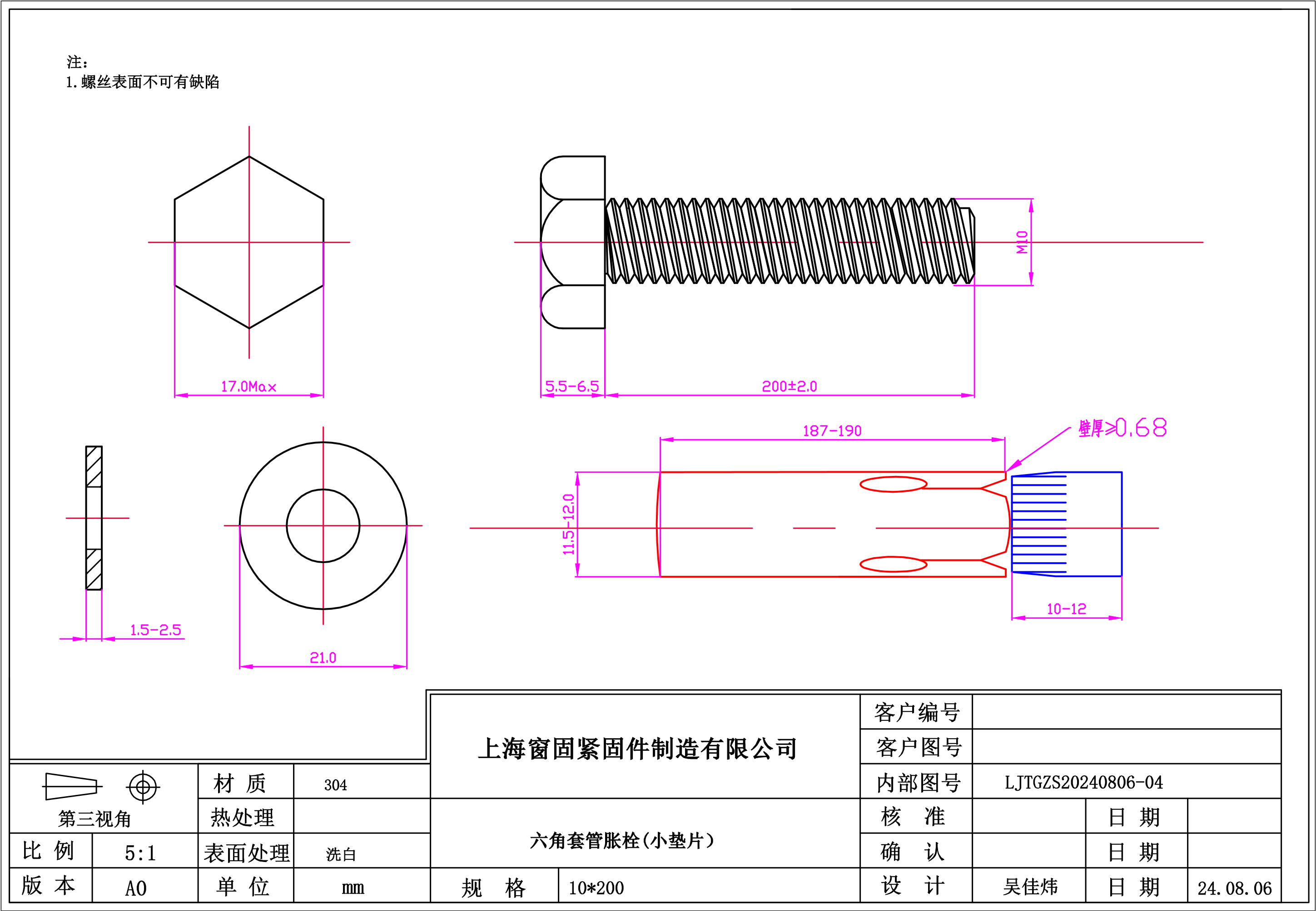 不锈钢304六角套管胀栓~10*200~洗白~(小垫片)