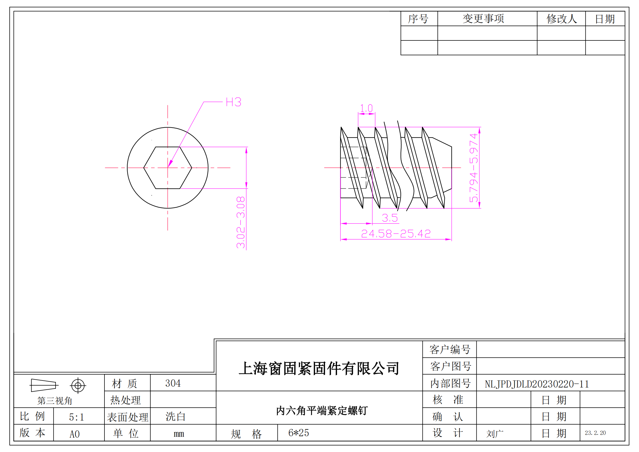 不锈钢304内六角平端紧定螺钉~6*25~洗白