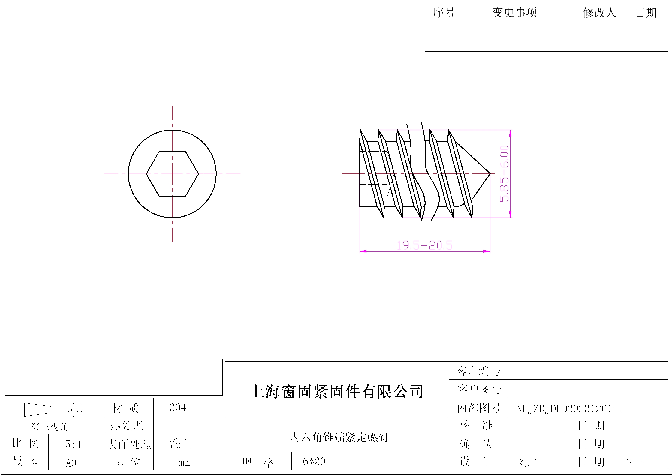 不锈钢304内六角锥端紧定螺钉~6*20~洗白
