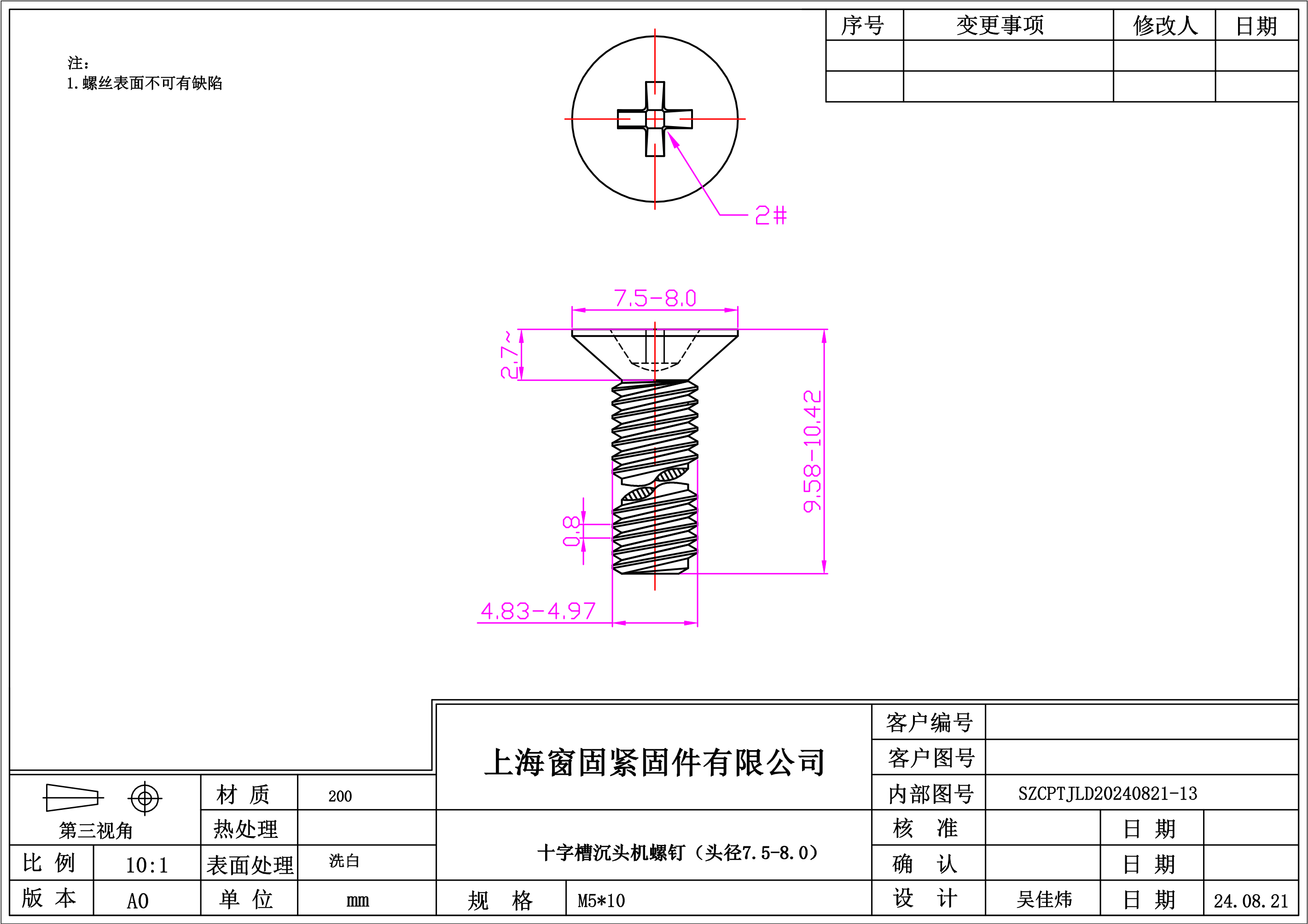 不锈钢200十字沉头机螺钉~5*10~洗白~(头径7.5-8)