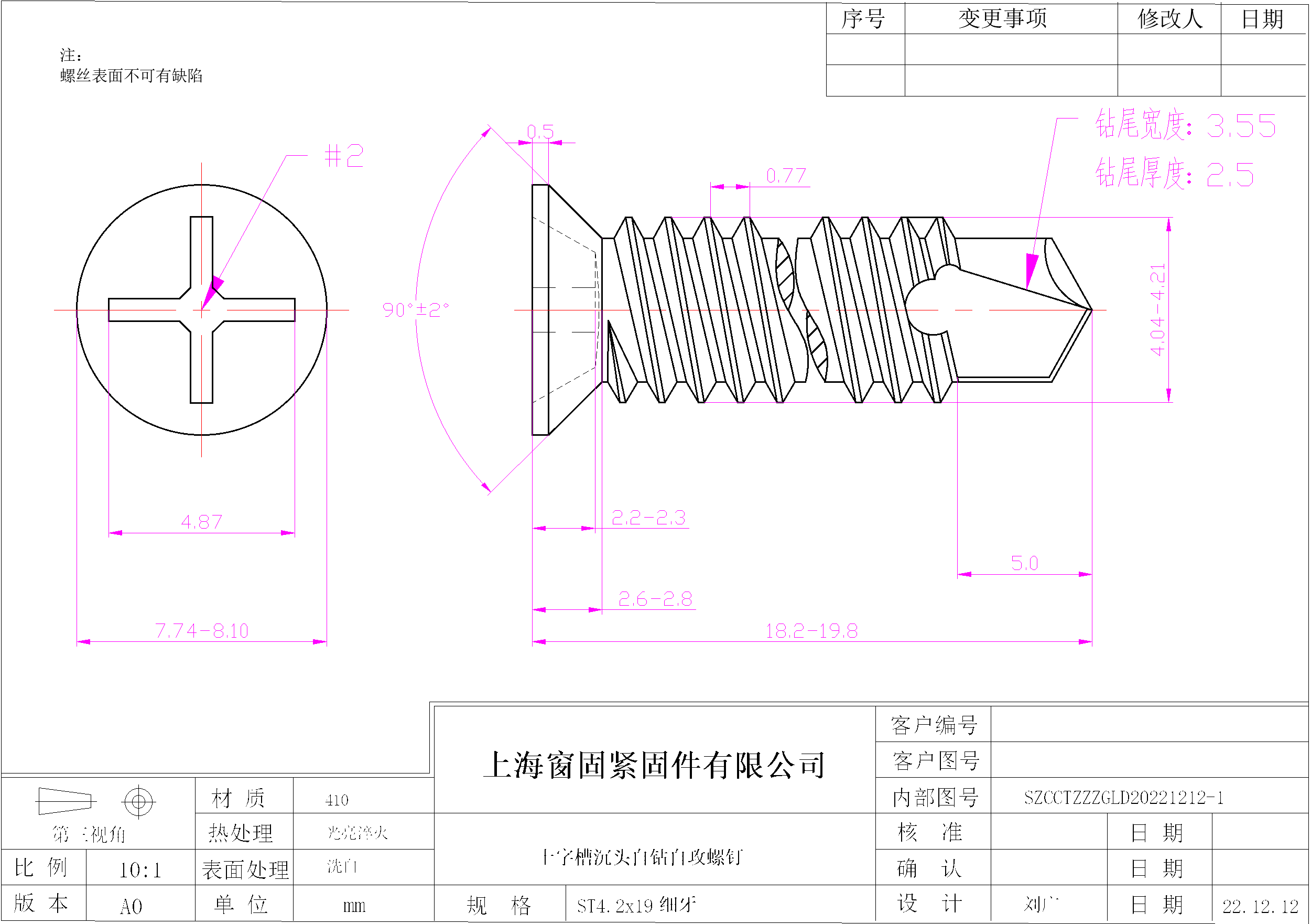 不锈钢410十字沉头细牙自钻自攻螺钉~4.2*19~洗白