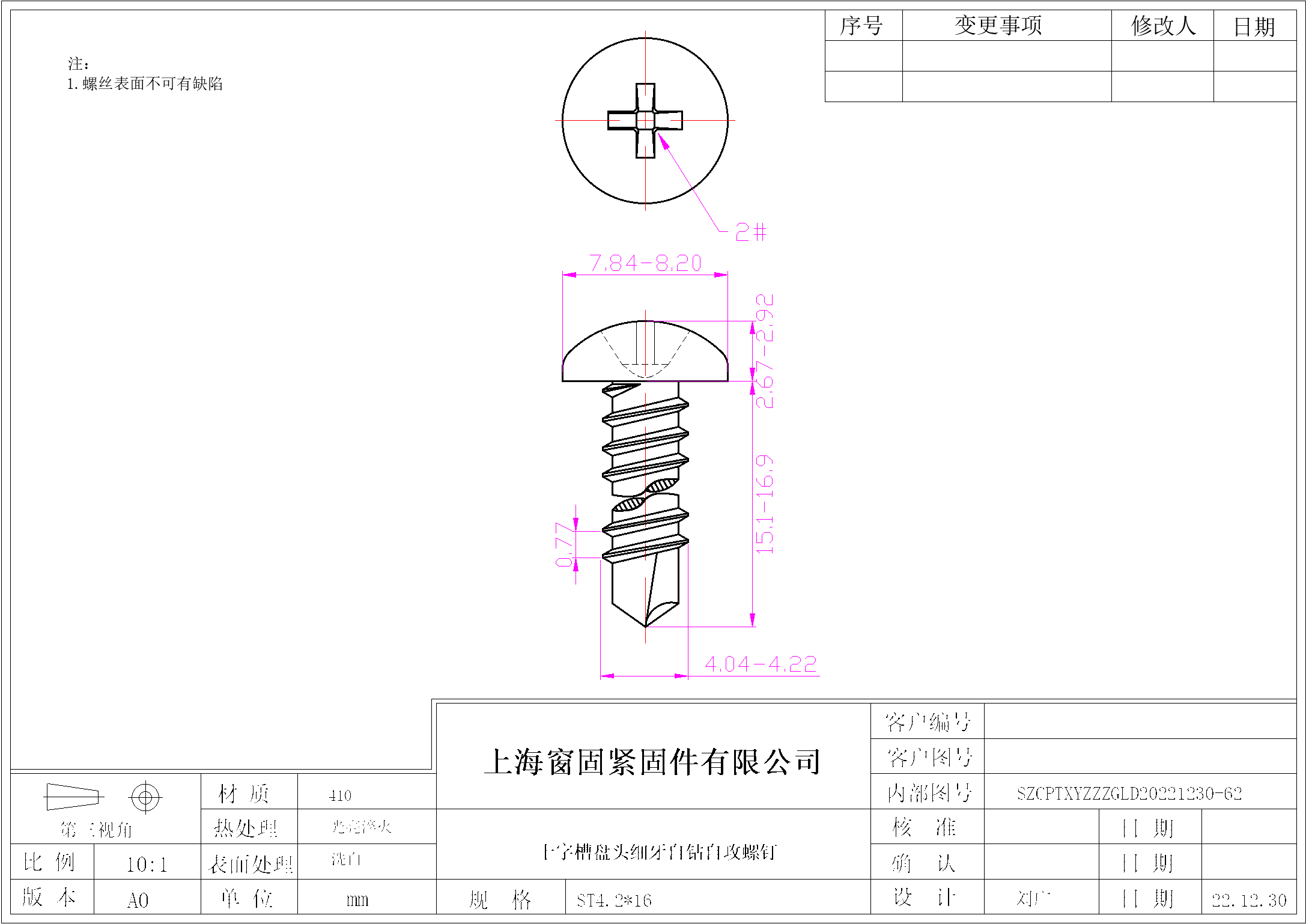 不锈钢410十字盘头细牙自钻自攻螺钉~4.2*16~洗白