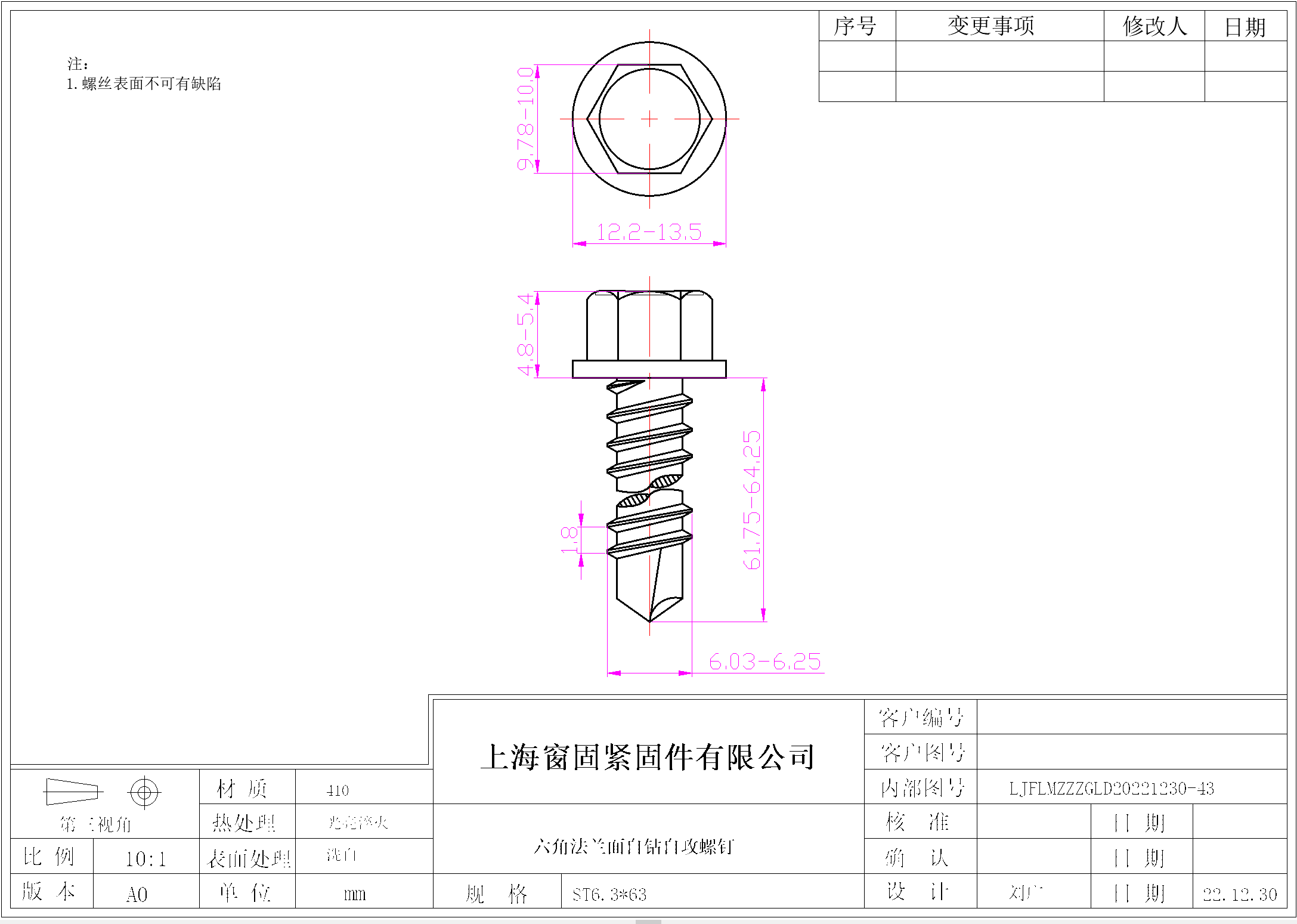 不锈钢410六角法兰面自钻自攻螺钉~6.3*63~洗白