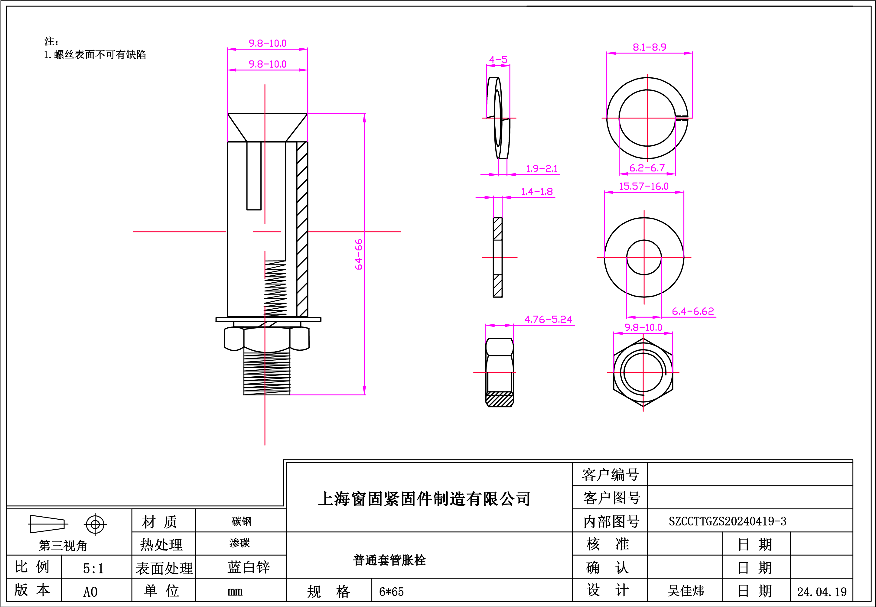 碳钢普通套管胀栓~6*65~蓝白锌~(铁)
