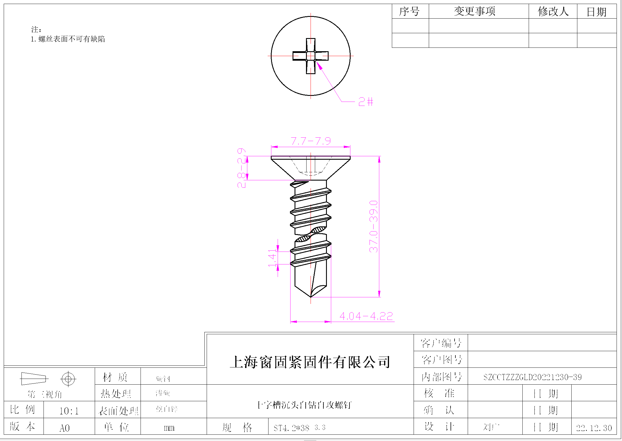 十字沉头自钻自攻螺钉~4.2*38~蓝白锌~(3.3)