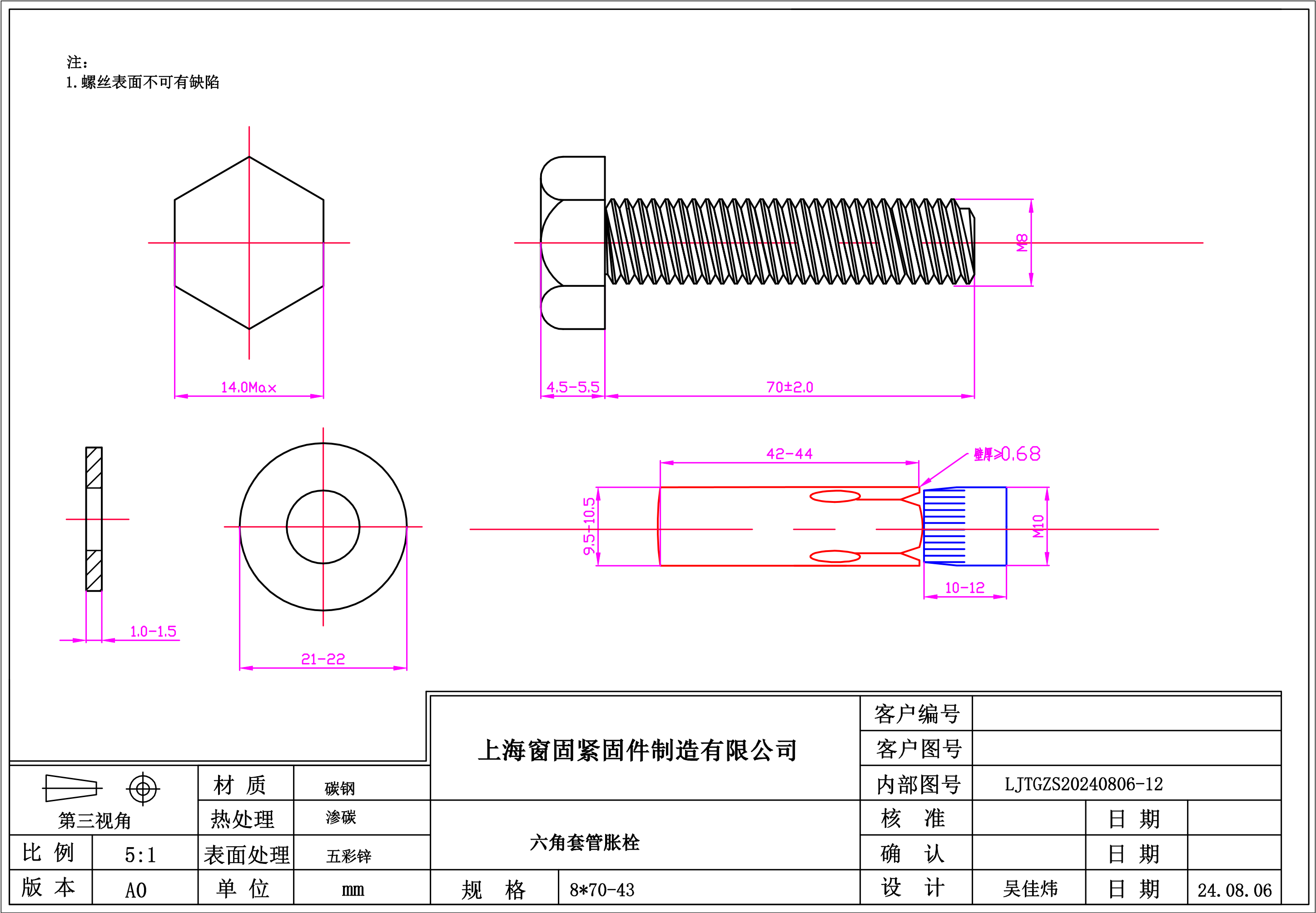 碳钢六角套管胀栓~8*70-43~五彩锌