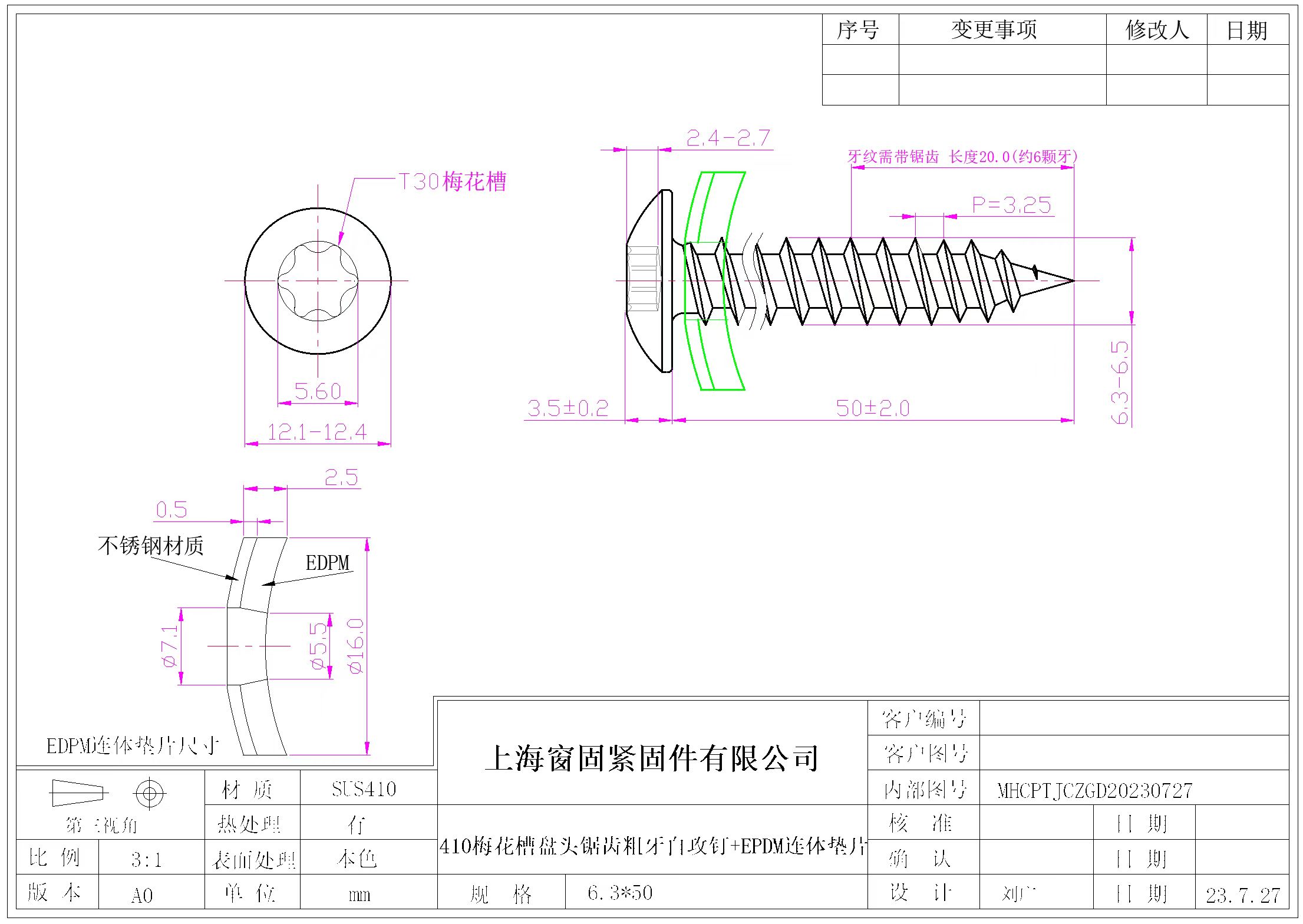 不锈钢410十字盘头锯齿粗牙木螺钉~6.3*50~洗白~(EPDM连体垫片)